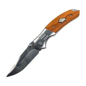 Poiščite popolno darilo za vsakega lovca, ki se spopada z divjimi prašiči, v preklopnem nožu, ki ne le izžareva moč in vzdržljivost, ampak tudi prinaša pristen občutek povezanosti z lovskim svetom. Ta izjemen nož je opremljen z lesenim ročajem, ki mu dodaja naraven in toplin občutek ter dodano značko divjega prašiča, ki je simbol moči in spretnosti v lovu.